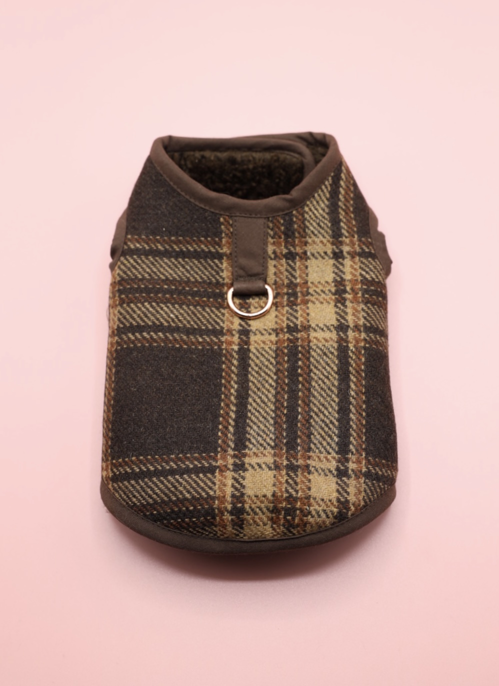 Stylowy płaszczyk w kratę z futerkiem w odcieniu czekolady to idealne połączenie funkcjonalności i modnego wyglądu. Zaprojektowany z myślą o komforcie Twojego pupila, świetnie sprawdzi się podczas jesiennych i zimowych spacerów.
