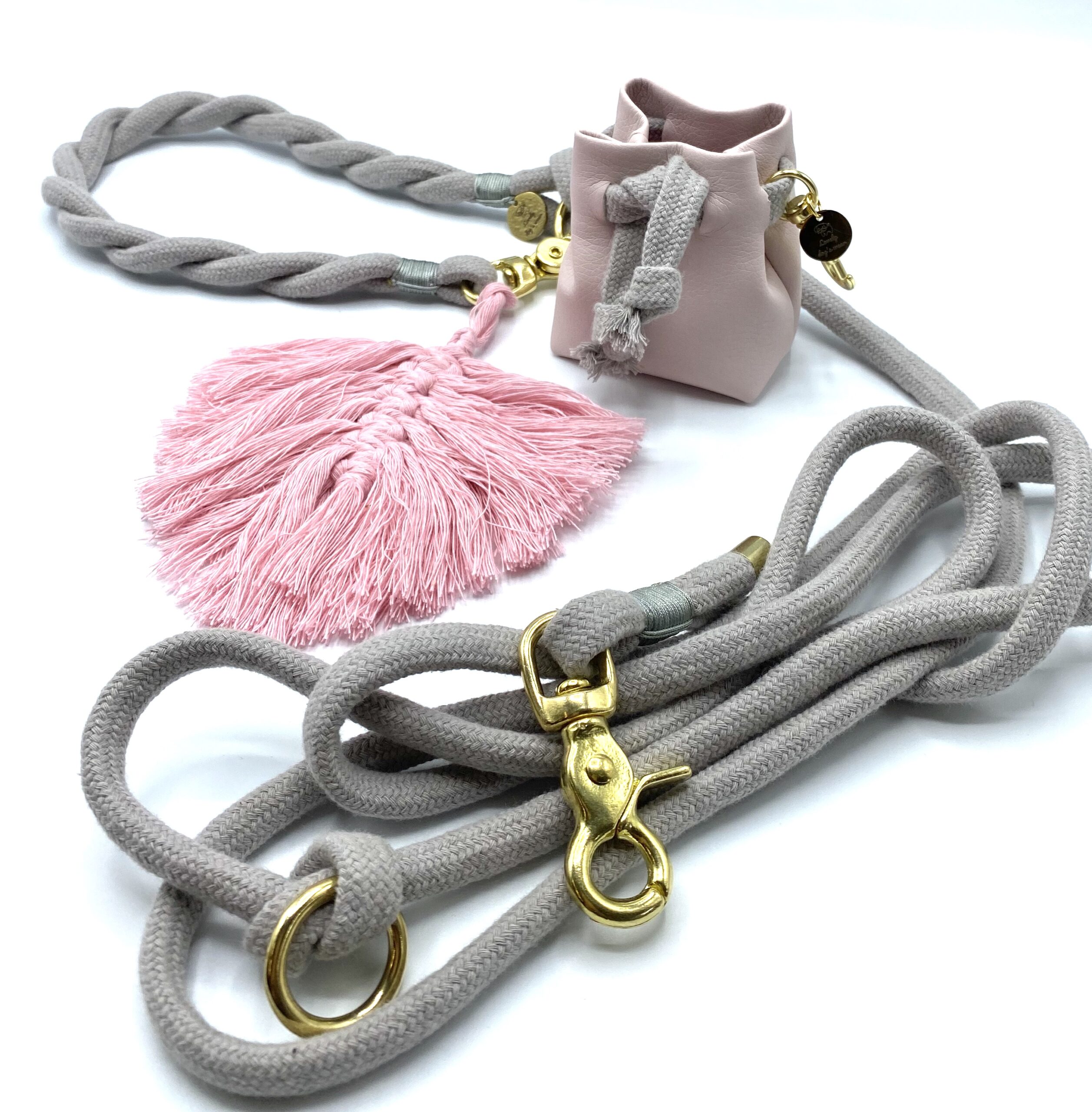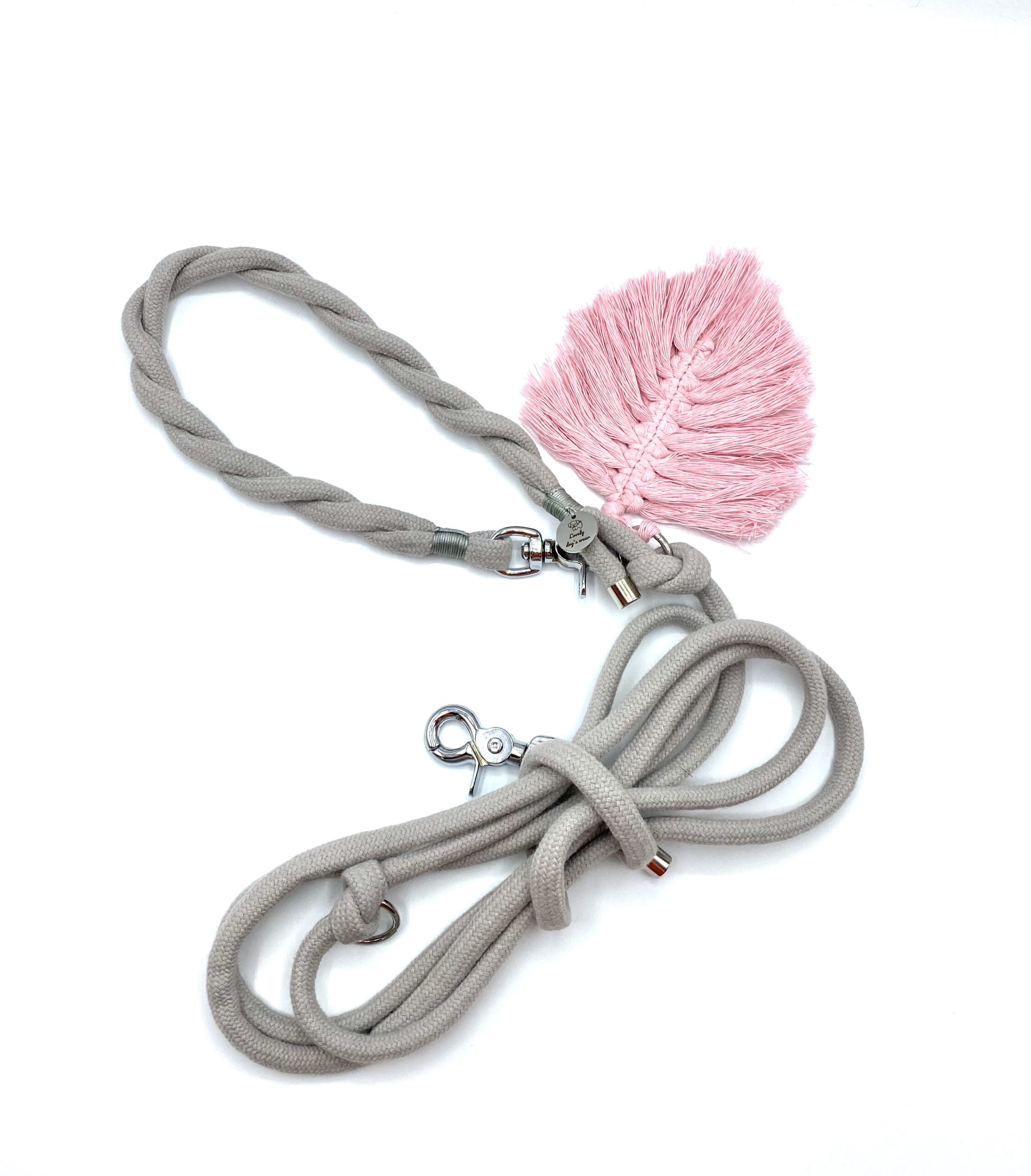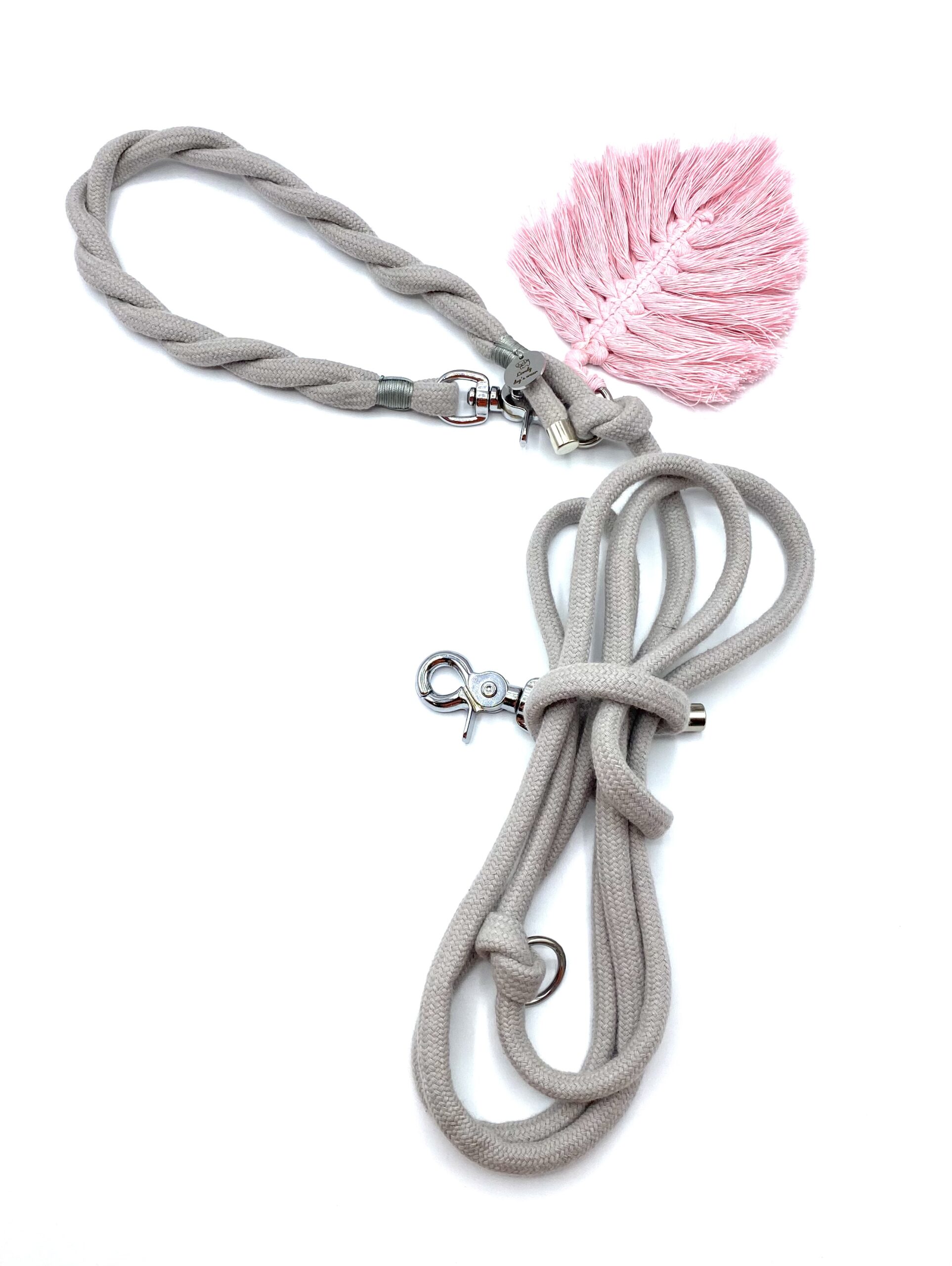 Smycz  przepinana  wykonana  jest  z bawełnianej liny o szerokości 10 mm , w jasno szarym kolorze. Została fantazyjnie spleciona  na rączce co daje lepszy  komfort  trzymania w dłoni, nie będzie się wrzynać podczas spacerów . Przepięcie umożliwia skrócenie smyczy i ewentualne przepięcie wokół pasa właściciela co ułatwia spacery, gdy pies mocno ciągnie.  Standardowa długość 150 cm, 200cm, 250 cm jednak możemy wykonać inne rozmiary. Istotną zaletą  jest wykorzystywanie do produkcji smyczy  okuć  najwyższej jakości. Okucia, których używamy  wykonane są z elementów stali nierdzewnej  o podwyższonej wytrzymałości oraz z mosiądzu  ( zalecane!). Posiadamy również okucia czarny mat i kolor różowego złota.  Zalecamy podanie wymiarów psiaka, dostosujemy wielkość karabinków. Polecamy  w komplecie  z szelkami guard  z serii Light Gray Angel lub obrożą.