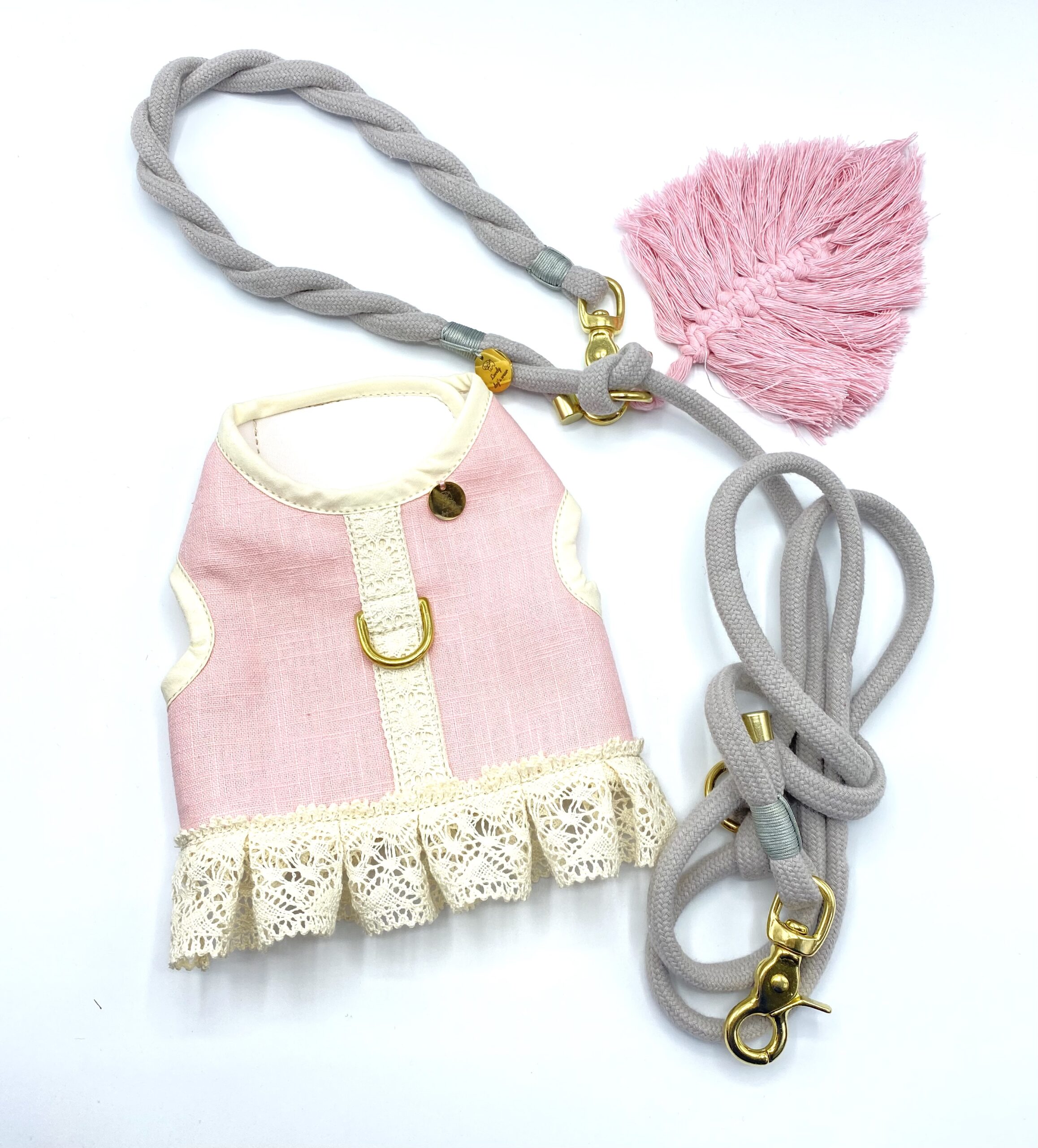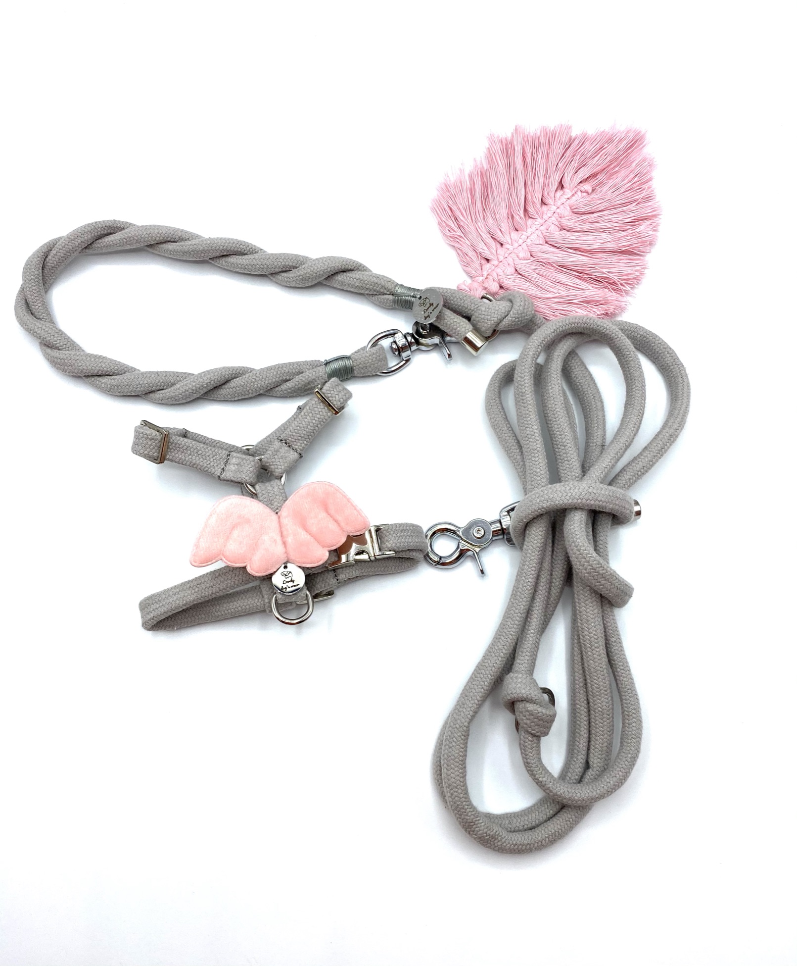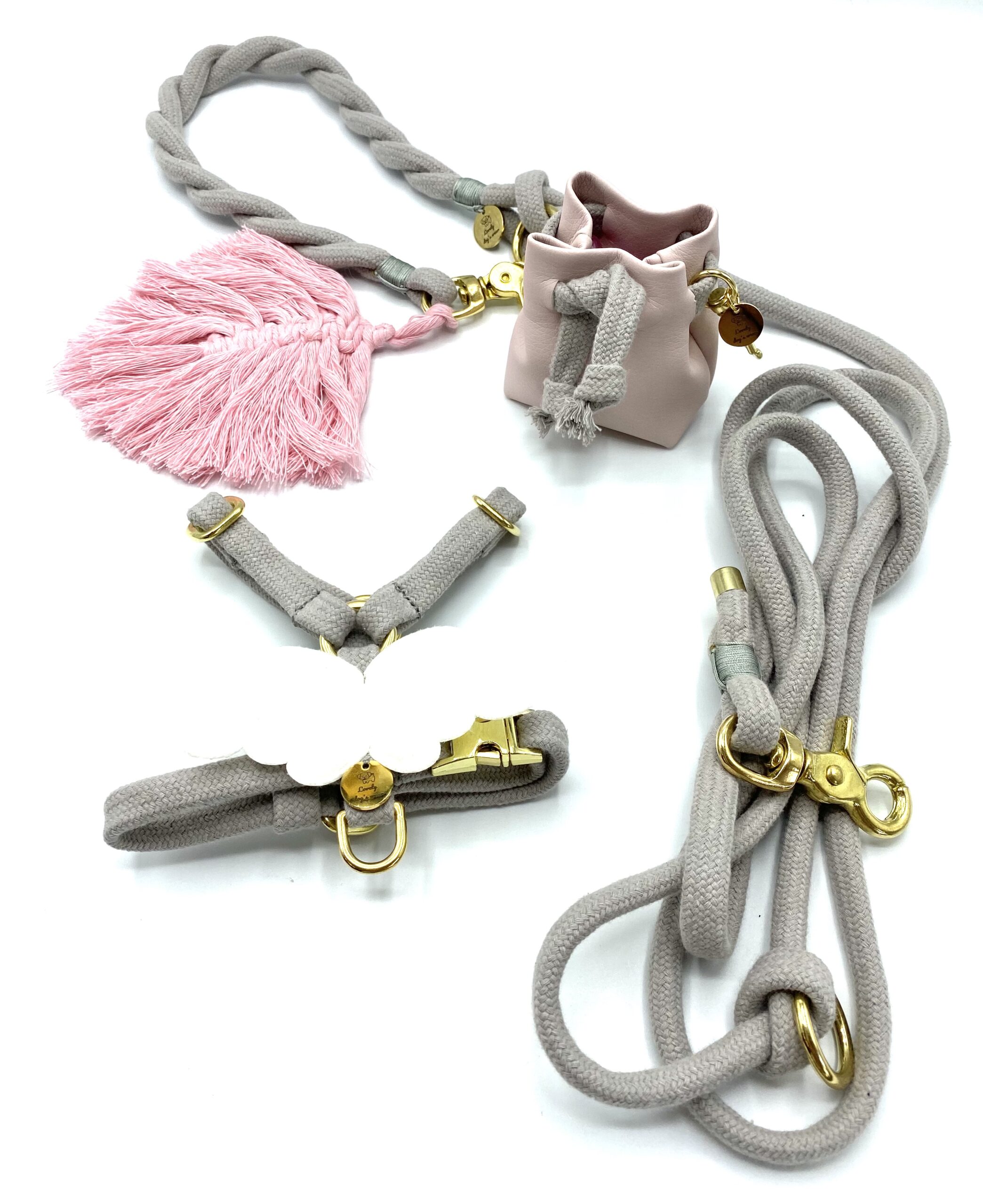 Smycz  przepinana  wykonana  jest  z bawełnianej liny o szerokości 10 mm , w jasno szarym kolorze. Została fantazyjnie spleciona  na rączce co daje lepszy  komfort  trzymania w dłoni, nie będzie się wrzynać podczas spacerów . Przepięcie umożliwia skrócenie smyczy i ewentualne przepięcie wokół pasa właściciela co ułatwia spacery, gdy pies mocno ciągnie.  Standardowa długość 150 cm, 200cm, 250 cm jednak możemy wykonać inne rozmiary. Istotną zaletą  jest wykorzystywanie do produkcji smyczy  okuć  najwyższej jakości. Okucia, których używamy  wykonane są z elementów stali nierdzewnej  o podwyższonej wytrzymałości oraz z mosiądzu  ( zalecane!). Posiadamy również okucia czarny mat i kolor różowego złota.  Zalecamy podanie wymiarów psiaka, dostosujemy wielkość karabinków. Polecamy  w komplecie  z szelkami guard  z serii Light Gray Angel lub obrożą.