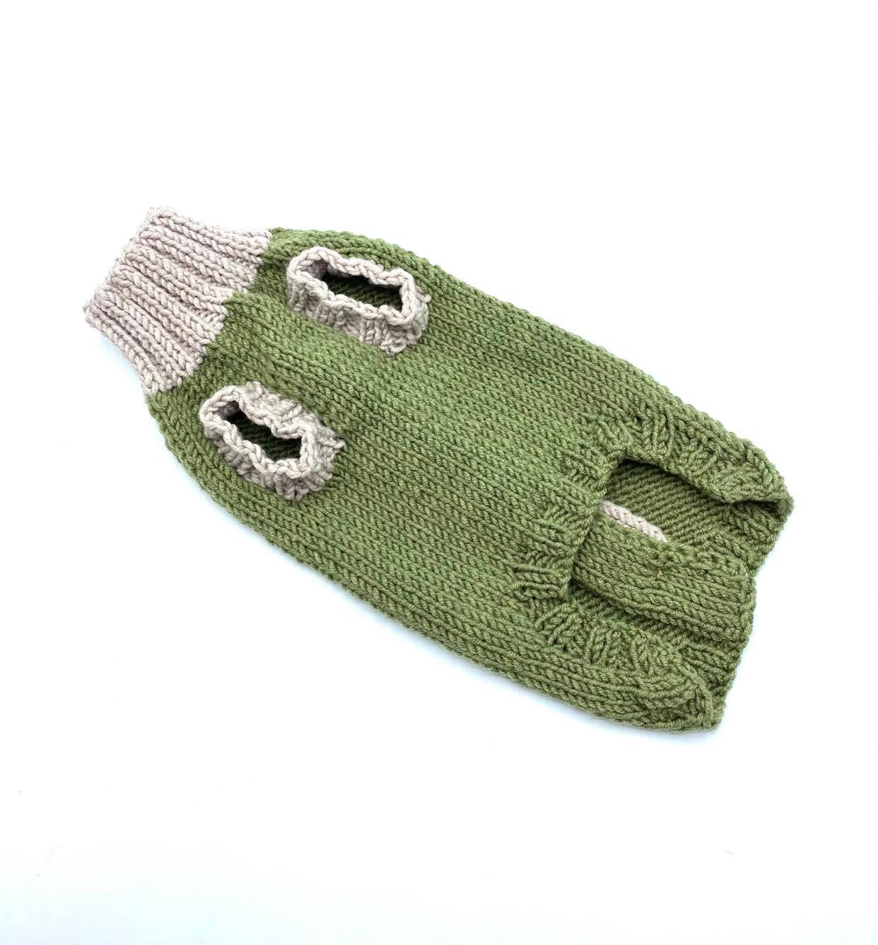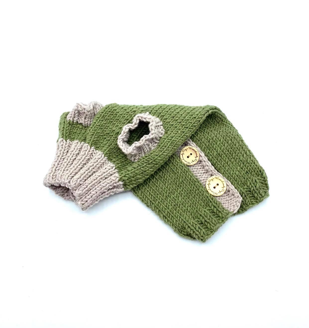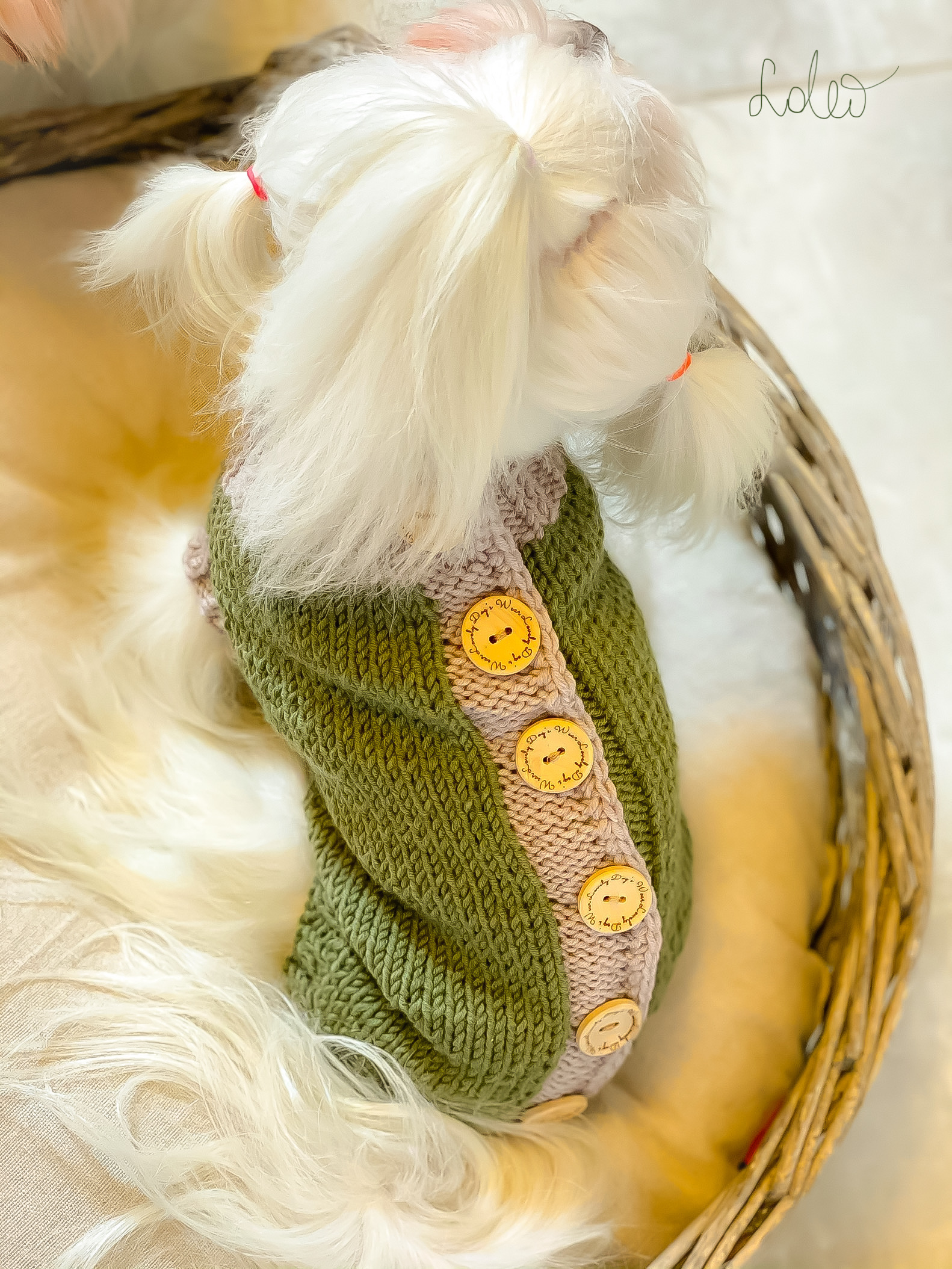 Sweterek wykonany ręcznie z mięciutkiej, naturalnej, ciepłej wełny z Merynosów. Wełna ta, jest miła w dotyku, elastyczna . Sweter jest zapinany na drewniane guziki, co ułatwia nam zakładanie sweterka na psiaka. Polecamy w komplecie ze smyczą i szelkami. Standardowo bez rękawków, możemy wykonać z rękawkami.