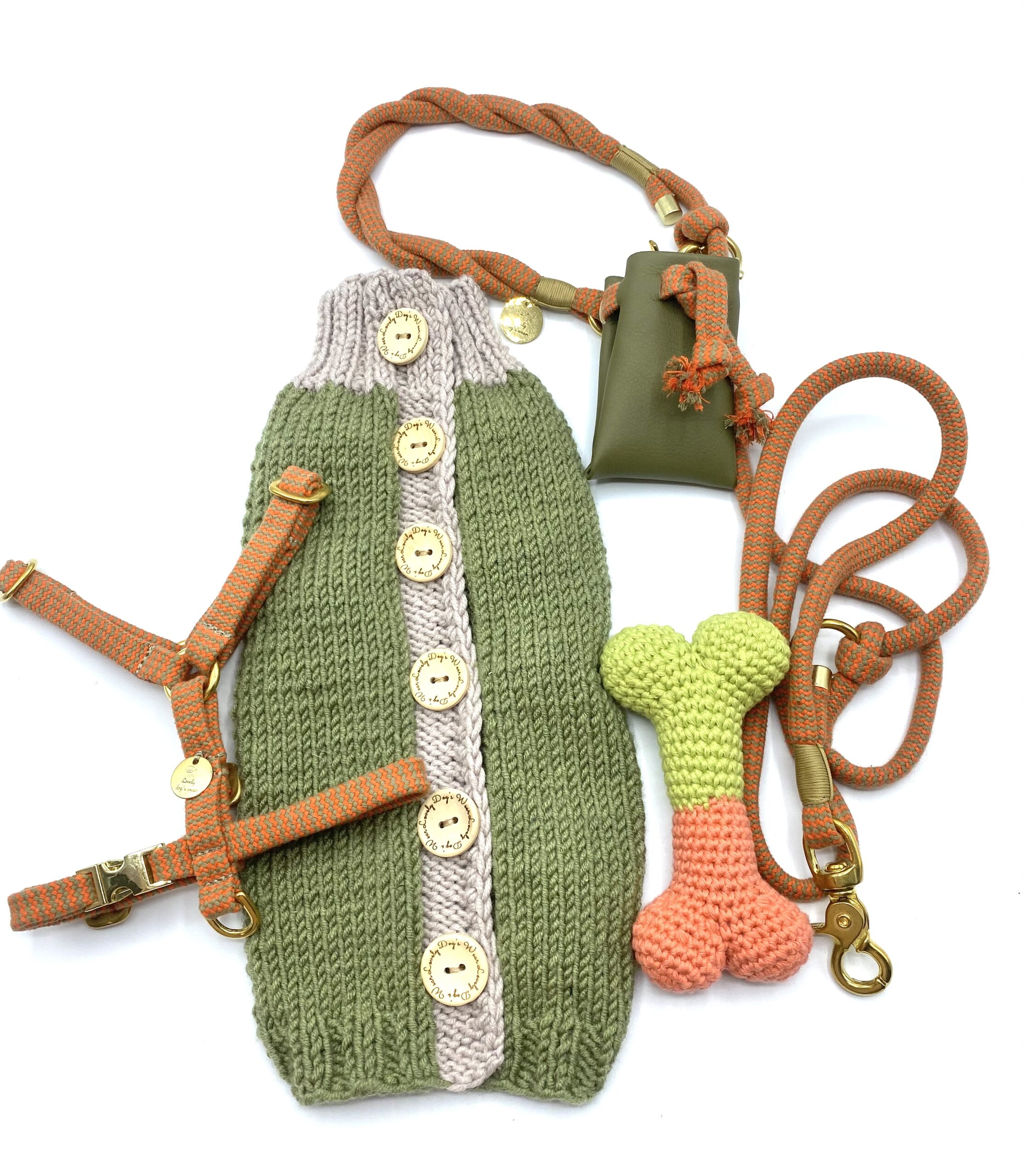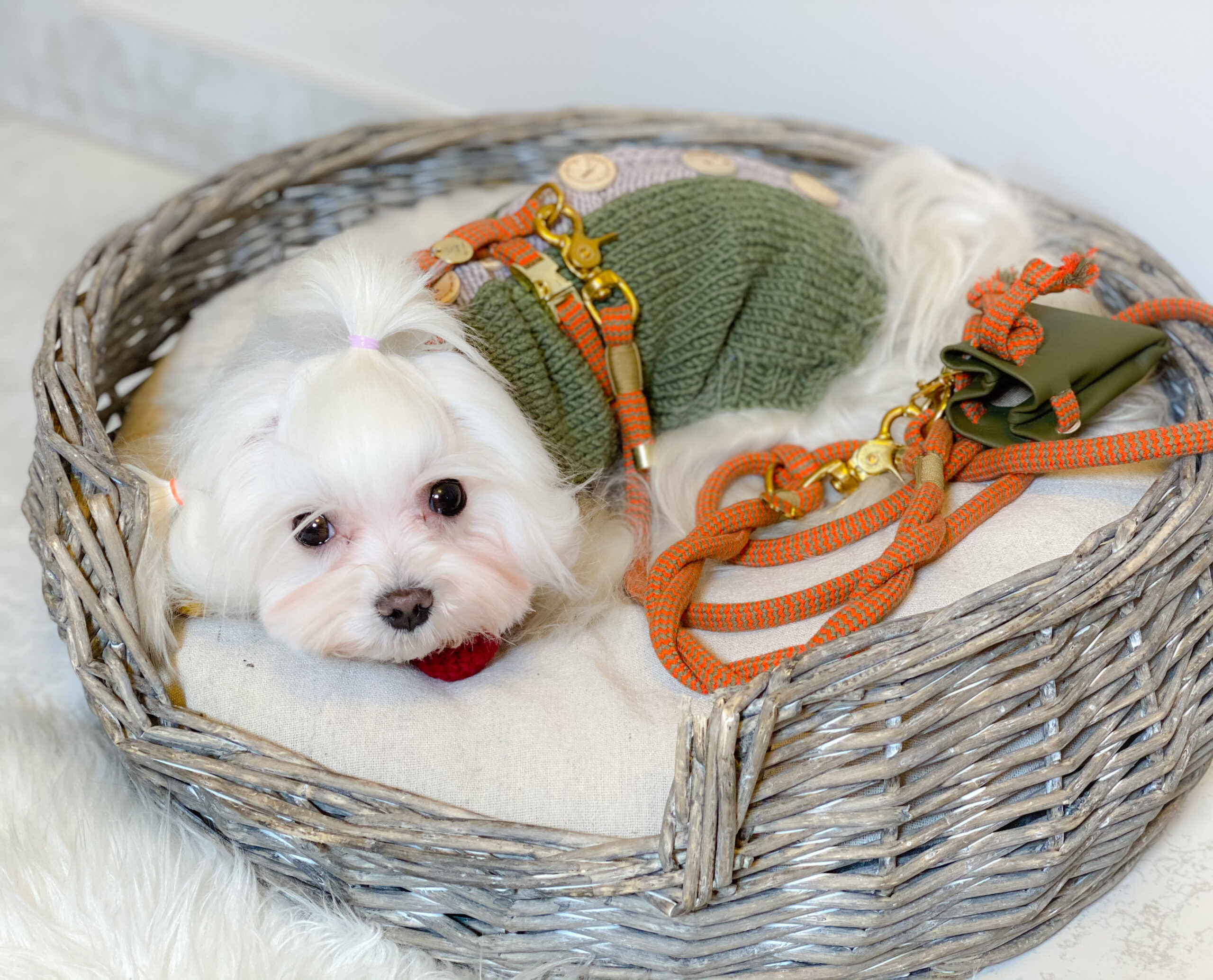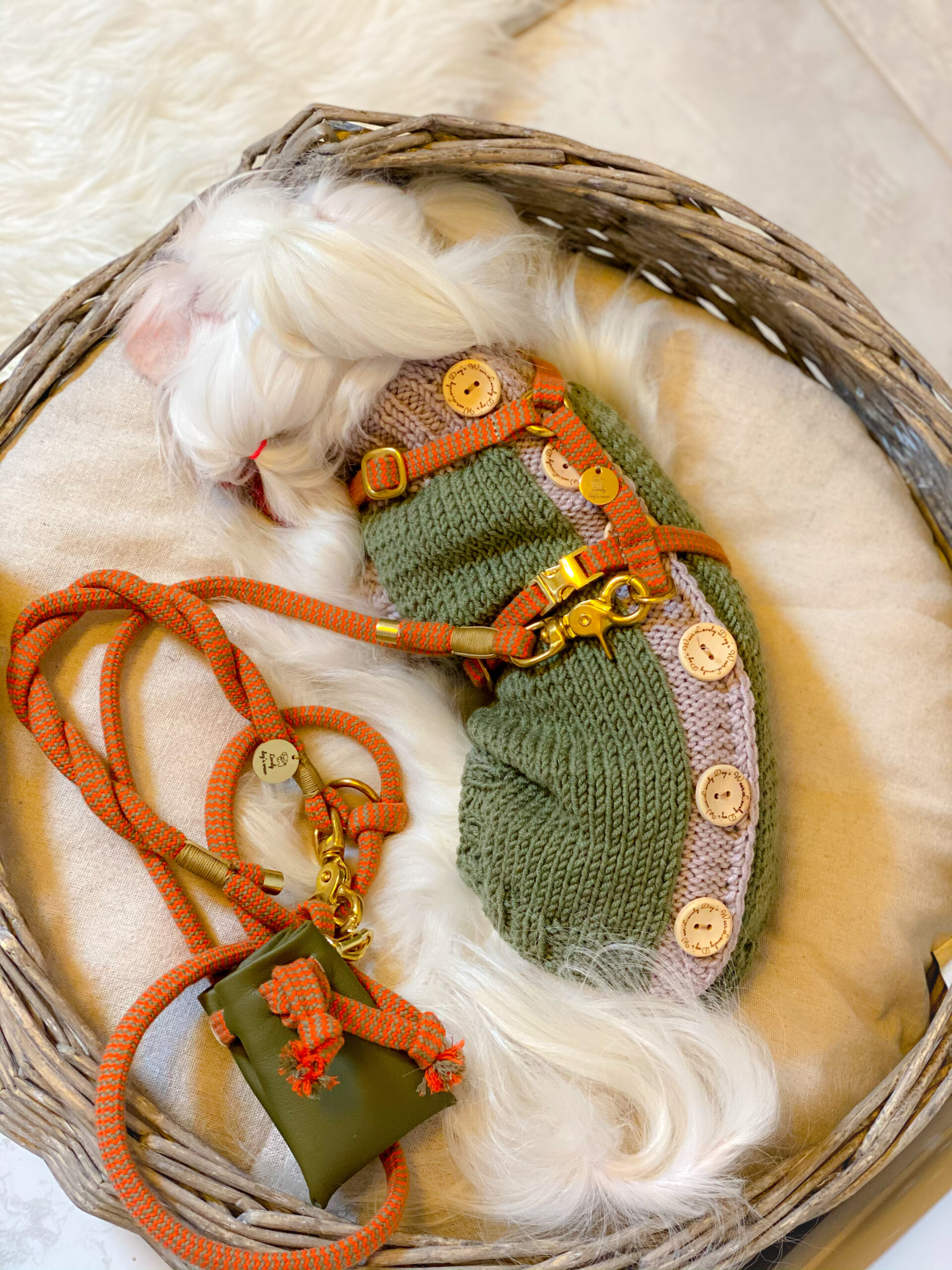 Sweterek wykonany ręcznie z mięciutkiej, naturalnej, ciepłej wełny z Merynosów. Wełna ta, jest miła w dotyku, elastyczna . Sweter jest zapinany na drewniane guziki, co ułatwia nam zakładanie sweterka na psiaka. Polecamy w komplecie ze smyczą i szelkami. Standardowo bez rękawków, możemy wykonać z rękawkami.